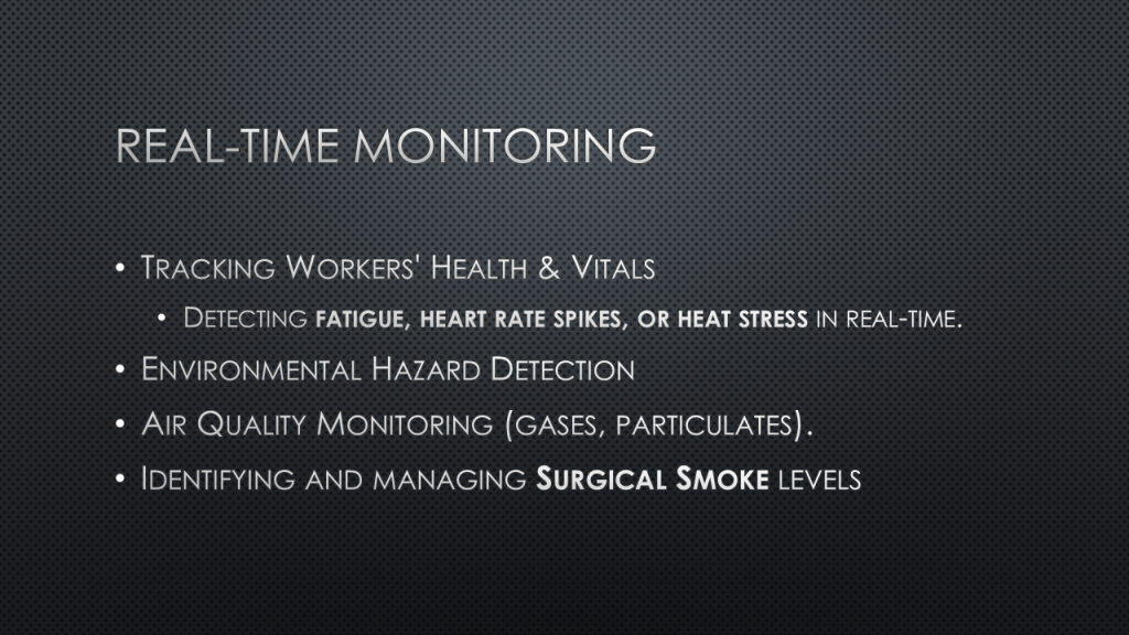 The facilities and environment can also be monitored by AI. Cameras and sensors in the operating room are able to check for hazards and alert staff if critical levels have been breached.