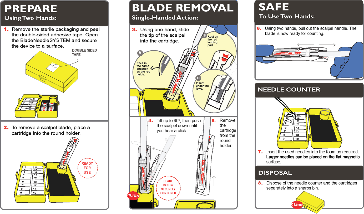After the count has been performed, the whole BladeNeedleSYSTEM unit should be disposed of as medical waste in a sharps container.