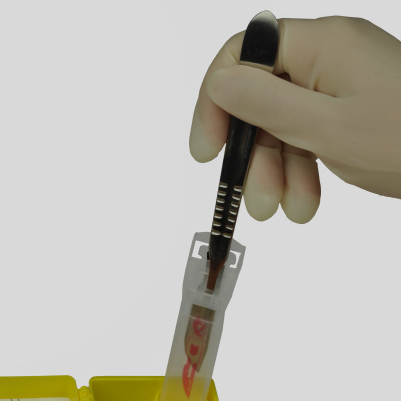 The process of activation, (i.e. pushing the loaded scalpel into the cartridge) should always be single-handed. There is no need to hold onto the BladeNeedleSYSTEM during this stage. Two hands are required only when removing the scalpel handle from the device after the blade is already safely secured in the cartridge.